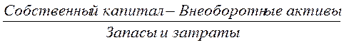 Данный коэффициент показывает какая часть запасов и затрат формируется за счет собственных источников, то есть не менее 60% всех запасов должны формироваться за счет собственных источников. Если у предприятия имеются собственные оборотные средства, то они направляются, прежде всего, на формирование запасов и затрат. Если у предприятия нет собственных оборотных средств, то в этом случае все запасы и затраты формируются за счет заемных источников.