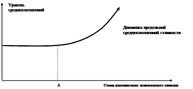 Точка А на представленном графике характеризует ту границу привлечения предприятием дополнительного капитала, преодоление которой вызывает рост предельной средневзвешенной стоимости капитала.