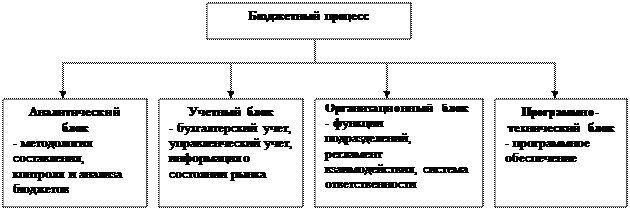 3. Бюджетный процесс не происходит в «безвоздушном пространстве», он всегда реализуется через соответствующую организационную структуру и систему управления, существующие на предприятии. Система управления бюджетированием – это регламент взаимодействия служб аппарата управления и структурных подразделений, закрепляющий в соответствующих внутренних нормативных актах и инструкциях обязанности каждого подразделения на каждой стадии бюджетного процесса. Организационная структура и система управления составляют организационный блок бюджетного процесса.