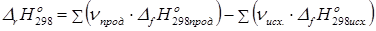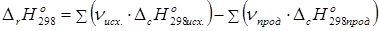 2. Тепловой эффект химической реакции равен сумме теплот образования продуктов за вычетом суммы теплот образования исходных веществ с учетом стехиометрических коэффициентов.