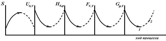 самопроизвольный процесс; --- – несамопроизвольный процесс