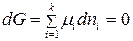 Полученное равенство представляет собой термодинамическое условие химического равновесия: при химическом равновесии алгебраическая сумма произведений химических потенциалов на стехиометрические коэффициенты равна нулю (произведения для продуктов реакции положительны, а для исходных веществ – отрицательны).