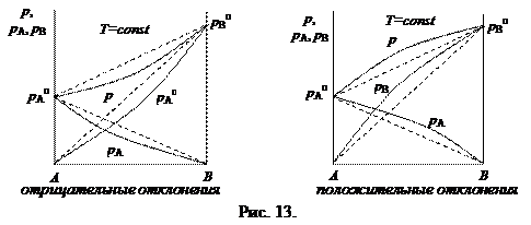Отклонения давления пара от линейной зависимости в сторону больших значений называют положительными, а в сторону меньших – отрицательными отклонениями от закона Рауля. Отклонения зависят от относительной величины энергии взаимодействия молекул жидкой смеси: если энергия взаимодействия между молекулами разных компонентов больше, чем между молекулами одного и того же вещества, то на кривой давления пара наблюдаются отрицательные отклонения. В противоположном случае наблюдаются положительные отклонения.