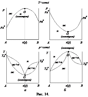 , которым отвечает максимум давления насыщенного пара (минимум температуры кипения) называют положи-тельными (рис. 14 а), а если минимум давления (максимум температуры кипения) – отрицательными азеотропами (рис. 14 б).
