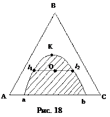 1. Если одна пара компонентов тройной системы ограниченно растворима друг в друге и полностью смешиваются с третьим компонентом, то диаграмма растворимости имеет вид (рис. 18):