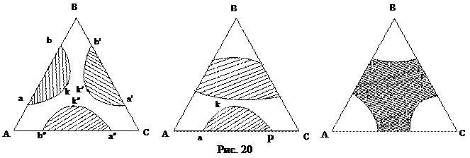 2. Если две пары компонентов ограниченно растворимы друг в друге, то диаграммы растворимости могут выглядеть (рис. 19):