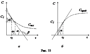 Кинетические кривые зависимости концентрации исходных веществ и продуктов реакции от времени изображены на рис. 33 а, 33 б.