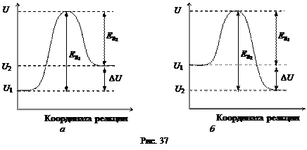 Изобразим график зависимости изменения внутренней энергии реагирующих веществ от некоторой координаты обратимой реакции (а – эндотермическая; б – экзотермическая реакция). На рис. 37: