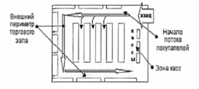 продаваться, если его позиция в магазине подобрана неудачно. В магазине существует естественное направление движения покупателей, которое должно определяться еще на стадии проектирования магазина: расположение входа, торгового оборудования в зале и касс. Движение потока покупателей должно быть рассчитано заранее и подобрано с максимальной выгодой, предоставляя на обозрение покупателю как можно больше товаров.