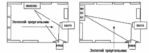 На рисунке показано, как можно изменить размеры "золотого треугольника". В первом примере входная дверь, самый ходовой товар (молоко) и касса расположены очень близко друг к другу. Во втором примере они раздвинуты, тем самым, увеличивая размер "золотого треугольника".