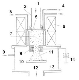 На Рис. 6 обозначено: 1 – ввод СВЧ мощности от магнетрона, работающего на частоте 2,45 МГц, 2 – волновод прямоугольного сечения, 3 – подвод охлаждающей воды, 4 – напуск аргона, 5 – кварцевое окно, 6 – электромагнит, 7 – разрядная камера, 8 – распыляемая мишень, 9 – напуск кислорода, 10 - подложкодержатель с пластиной, 11 – плазменный поток, 12 – откачка, 13 - рабочая камера, 14 – источник питания.