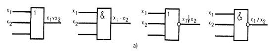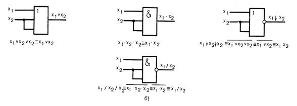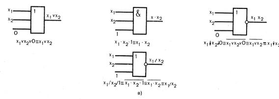 Здесь на свободные входы элементов ИЛИ и ИЛИ-НЕ подается постоянный потенциал уровня, соответствующего логическому 0, а для элементов И и И—НЕ — потенциал уровня, соответствующего логической 1.