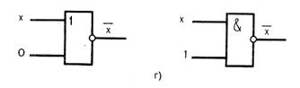 В качестве инверторов обычно применяются элементы ИЛИ—НЕ или И—НЕ, в которых используется лишь один вход, остальные входы соединяются способом, описанным выше (рисунок 1.2.9.6.)