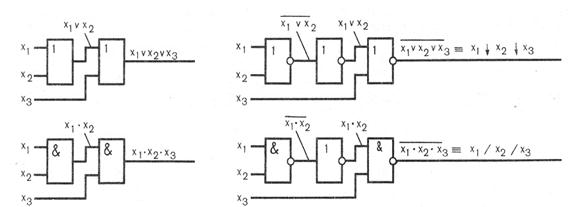 На рисунке 1.2.9.7. показан способ реализации трехбуквенного члена логического выражения функции на различных типах элементов с двумя входами.