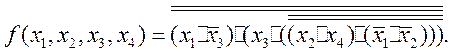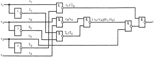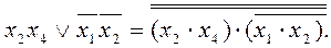 Пусть требуется построить устройство, реализующее () на двухвходовых элементах И—НЕ. В логическом выражении сгруппируем два последних члена, вынеся за скобки х3 идважды проинвертируем его.