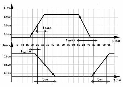Динамические параметры характеризуют быстродействие интегральной схемы и ее устойчивость к воздействию импульсных помех. Динамические параметры определяются по переходной характеристике элемента «НЕ». Необходимо учесть, что «лог. 0» и «лог. 1» определяются по уровням 0,1Um и 0,9Um (рисунок 1.3.3.1.)