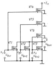 Только когда на всех входах присутствует низкий потенциал U0 (xl=x2 = x3 = 0), управляющие транзисторы заперты, а нагрузочные — открыты. Поэтому падение напряжения на нагрузочных транзисторах мало, а на управляющих — велико: на выходе высокий потенциал U1 (у=1). Таким образом, при x1=1 у=0, при x1 = x2 = x3 = 0 у=1, т. е. элемент реализует функцию ИЛИ—НЕ: