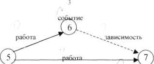 Любая работа - стрелка соединяет только два события и отражает процесс перехода от одного события к другому. Событие, из которого стрелка выходит, называется начальным или предшествующим по отношению к данной работе. Событие, в которое стрелка входит, является конечным или последующим. Одно и то же событие (кроме начального и конечного) одновременно является и предшествующим и последующим