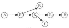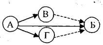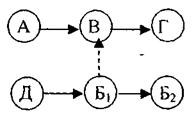 если для выполнения одной из работ (напр. ВГ), необходимо получение результатов всех работ, входящих в начальное для них событие, а для другой работы (напр. ВЕ) - только одной или нескольких из этих работ (напр. ДВ), то в сеть должно быть дополнительно введено новое событие (В1), отражающее результаты только этих последних работ, и фиктивная работа (В1 В), связывающая новое событие с прежним (рис.9).