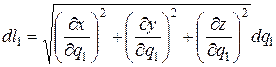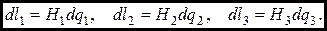 Рассмотрим сначала ребро MM 1. Точка M имеет криволинейные координаты (q 1, q 2, q 3), а точка M 1 – криволинейные координаты (q 1+ dq 1, q 2+ dq 2, q 3+ dq 3). Обозначив декартовы координаты точки M 1 – через (x + dx, y + dy, z + dz), мы можем написать, что длина dl 1 вектора