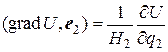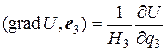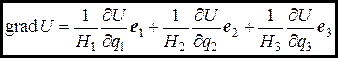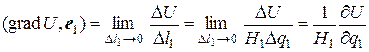 Пусть в некоторой области пространства, в которой введены криволинейные координаты q 1, q 2, q 3, задано дифференцируемое скалярное поле u(M). Найдем выражение градиента в ортогональных криволинейных координатах. Проекция градиента функции u=u(q 1, q 2, q 3) на некоторое направление, совпадает, как известно, с производной от u по этому направлению. Следовательно, для того чтобы вычислить компоненты gradu в базисе { e 1, e 2, e 3} нужно вычислить производные от U по направлениям, определяемым этими векторами. Пусть DU – разность значений функции U в точках M 1 и M. Тогда