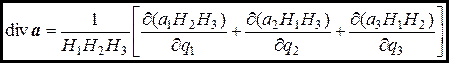 Пусть в некоторой области пространства, в которой введены криволинейные координаты q 1, q 2, q 3, задано дифференцируемое векторное поле a (M). Найдем выражение дивергенции в ортогональных криволинейных координатах. По определению div a в точке M задается формулой: