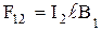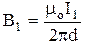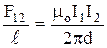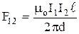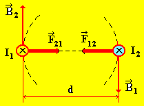 Каждый элемент проводника с током I1 находится в магнитном поле индукции В2, созданным проводником с током I2, и, наоборот, каждый элемент проводника с током I2 находится в магнитном поле индукции В1, созданным проводником с током I1. Расстояние между проводниками d.