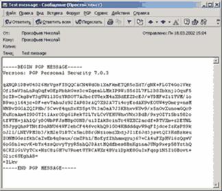 Для защиты самого сообщения от несанкционированного прочтения существует второй способ защиты, основывающийся на различных алгоритмах локального шифрования пересылаемой информации. Здесь с рабочего компьютера пользователя уходит уже зашифрованное сообщение, что делает бессмысленным перехват сообщения на этапах его передачи от отправителя к получателю. В результате под удар попадают локальные компьютеры отправителя и получателя, поскольку только на них происходит прямое и обратное шифрование сообщения и хранится ключ3 шифрования/дешифрования. В этом случае необходимо уделять повышенное внимание защите рабочих станций участников переписки. Само шифрование осуществляется специальным программным обеспечением (речь о котором пойдет ниже), работающим в качестве надстройки над обычным почтовым клиентом. В результате по окончании работы над письмом и его отправки (после нажатия на клавишу «Отправить») происходит шифрование отправления и передача его на сервер в уже зашифрованном виде. Пример такого сообщения показан на рис.3.