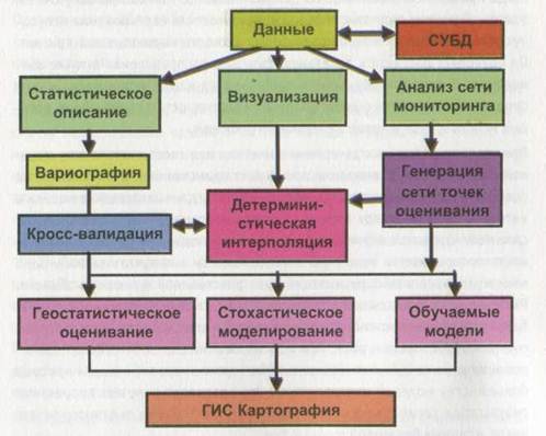 Конечно, это деление до известной степени условно. Так, геостатистические модели можно изложить в детерминистической формулировке, и наоборот, некоторые детерминистические модели имеют близкие статистические аналоги. В свою очередь, статистический подход, на котором базируется геостатистика, включает регрессионные модели пространственных интерполяций (предсказаний) и методы стохастического моделирования, цели и задачи которых различны. Алгоритмы, основанные на обучении (или искусственный интеллект), также имеют статистическую интерпретацию.