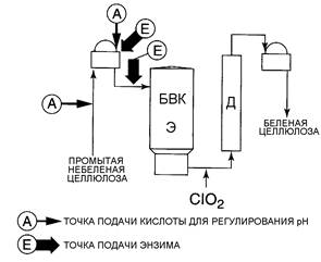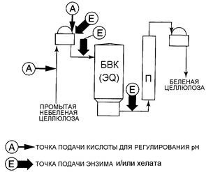 Раствор энзима вводится в целлюлозную суспензию перед её подачей в БВК. Когда энзим добавлен к небеленой целлюлозе, необходимо довести рН до уровня, при котором энзим активен. Обычно это интервал рН 4-9. Некоторые энзимы могут быть введены вместе с хелатирующим реагентом на ступень хелатирования (Q) при рН примерно 4,0-4,5 или сразу же после ступени обработки озоном при рН 3,5.