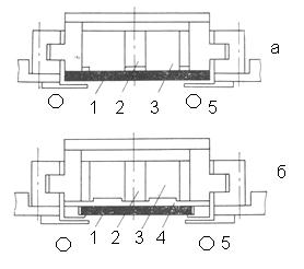 В схеме Рис. 1 а предусмотрено прямое охлаждение распыляемой мишени водой, в схеме Рис. 1 б – косвенное охлаждение На Рис. 1 обозначено: 1 – мишень-катод, 2 – магнитная система, 3 – канал охлаждения, 4 – держатель мишени, 5 – анод.
