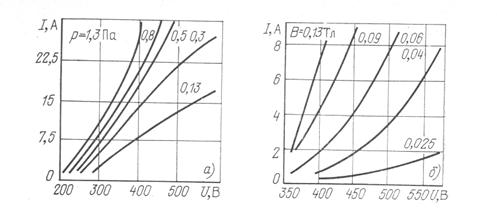 На Рис. 2 приведены вольт – амперные характеристики планарной магнетронной системы при распылении алюминия в аргоне от давления рабочего газа при магнитном поле 0,03 Тл (а) и в зависимости от величины магнитного поля при давлении аргона 0,3 Па (б).