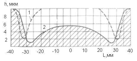 Рис. 3. Зона эрозии мишени обычного планарного магнетрона (1) и магнетрона с подвижной магнитной системой (2).