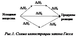 Действие закона Гесса удобно представить в виде схемы. Рассмотрим некоторый обобщенный химический процесс превращения исходных веществ в продукты реакции, который может быть осуществлен различными путями в одну или несколько стадий (рис. 1).