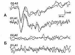 Рис. 6. Изменение ЗВП при поражении зрительного нерва справа. При стимуляции правого (Б) глаза ЗВП отсутствуют как в левом (O1-A1), так и правом (02-А2) полушарии. При стимуляции левого глаза (А) ЗВП четко регистрируются в обоих полушариях.