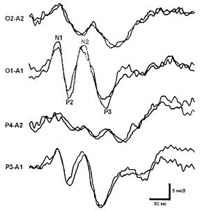 Рис. 7. Пример нарушения ЗВП у больного с внутримозговой опухолью теменно-затылочной области справа. Отмечается увеличение латентных периодов и снижение амплитуды основных компонентов ЗВП в правом полушарии (02-А2, Р4-А2).