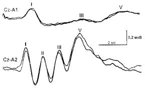 Рис. 8. АСВП у больной А., 34 л. с невриномой слухового нерва слева. Вверху - АСВП при стимуляции левого уха, видно значительное увеличение межпиковых латентностей и снижение амплитуды компонентов. Внизу - АСВП при стимуляции правого уха - параметры ответа в норме.
