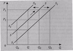 Кривая предложения сдвинется вправо от SS к S1S1, если при тех же затратах на рынке предлагается большее количество товаров. Уменьшение же предложения товара сместит кривую предложения влево от SS к S 2 S 2.