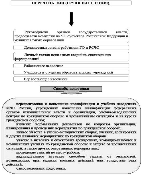 Подготовка населения, занятого в сферах производства и обслуживания и не входящего в состав сил единой государственной системы предупреждения и ликвидации чрезвычайных ситуаций, осуществляется путем проведения занятий по месту работы и самостоятельного изучения действий в чрезвычайных ситуациях согласно рекомендуемым программам с последующим закреплением полученных знаний и навыков на учениях и тренировках. Подготовка учащихся общеобразовательных учреждений и учреждений начального, среднего и высшего профессионального образования осуществляется в учебное время по образовательным программам в области защиты от чрезвычайных ситуаций.