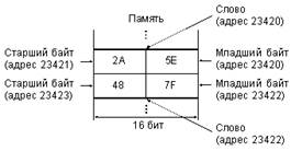 При обращении к целому слову (с содержимым 2А5Е) процессор выставляет адрес 23420. При обращении к младшему байту этой ячейки (с содержимым 5Е) процессор выставляет тот же самый адрес 23420, но использует команду, адресующую байт, а не слово. При обращении к старшему байту этой же ячейки (с содержимым 2А) процессор выставляет адрес 23421 и использует команду, адресующую байт. Следующая по порядку 16-разрядная ячейка памяти с содержимым 487F будет иметь адрес 23422, то есть опять же четный. Ее байты будут иметь адреса 23422 и 23423.