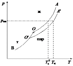 Жидкость кипит, когда давление насыщенного пара над ней равно внешнему давлению. Поскольку давление насыщенного пара над раствором (кривая О¢А¢) меньше, чем над чистым растворителем (кривая ОА), растворы, по сравнению с чистым растворителем кипят при более высокой температуре. Разность между температурами кипения раствора Т к и чистого растворителя