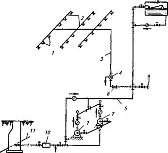 1 — спринклеры; 2 — распределительная сеть; 3 — главная питательная труба; 4 — контрольно-сигнальный клапан; 5 — магистральная труба; 6 — главная задвижка; 7 — насосная установка (основной водопитатель); 8 — водонапорный бак (автоматический водопитатель); 9 — аварийное подключение; 10 — водомер; 11 — городская магистраль водопровода