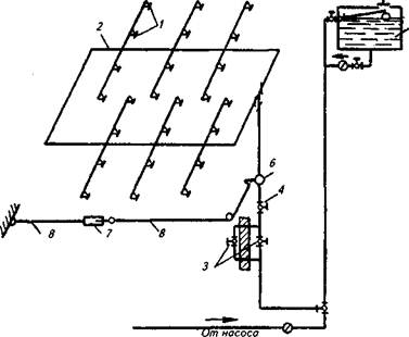 1 — дренчеры; 2 — распределительная сеть; 3 — запорные устройства; 4 — главный запорный вентиль; 5 — бак автоматического водопитателя; 6 — запорный клапан; 7 — легкоплавкий замок; 8 — трос