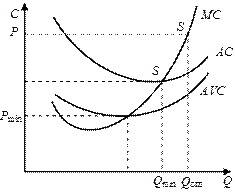 Кривая предложения предприятия (SS) совпадет в этом случае с линией предельных издержек, лежащих выше минимального уровня средних издержек.