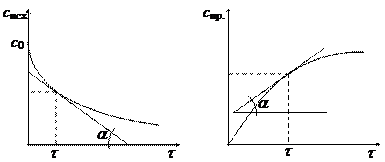 Скорость реакции в момент времени t равна тангенсу угла наклона касательной, проведенной к кинетической кривой с = f (t) в точке, соответствующей времени t (см. рис.):