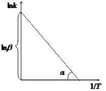 Из полученного уравнения следует, что для любой химической реакции зависимость ln k от 1 / Т описывается прямой линией (см. рис.). Тангенс угла наклона прямой равен