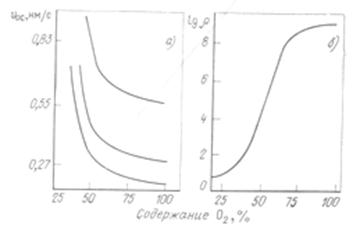 Рис. 5. Зависимости скорости осаждения (а) и электросопротивления (б) пленок ZnO от содержания кислорода в смеси.