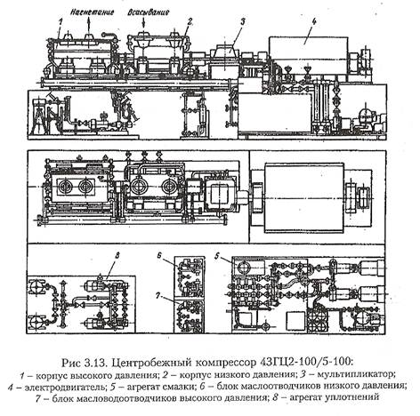 Компрессор типа 43ГЦ2-100/5-100 предназначен для компримирования нефтяного газа и подачи его в высоконапорную систему распределения при газлифтной эксплуатации скважин. Состоит он из электродвигателя, соединенного через мультипликатор с двумя корпусами сжатия: низкого (КНД) и высокого (КВД) давлений.