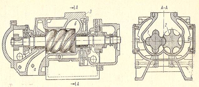 На рис. представлен винтовой компрессор. Работа компрессора осуществляется следующим образом. В корпусе компрессора 3 вращаются два ротора: ведущий 1 и ведомый 2. Поверхности роторов выполнены в виде винтов и находятся в зацеплении таким образом, что выступы ведомого вала входят во впадины ведущего. При всасывании газа из зоны а газ попадает во впадины ведущего ротора, которые выполняют роль цилиндров. Роль поршня выполняют выступы ведомого вала, которые, заполняя последовательно всю длину канала, образованного впадинами, постепенно осуществляют сжатие газа. В момент, когда сечение впадин оказывается перед нагнетательным отверстием, газ, сжатый до конечного давления, поступает в систему нагнетания (зона 6).