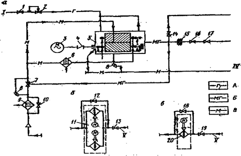 11.- блок маслоохладителя 7ВГК-50/7; 12, 18 – перепускные клапаны; 14- предохранительный клапан; 15- компенсатор; 16 - обратный клапан;